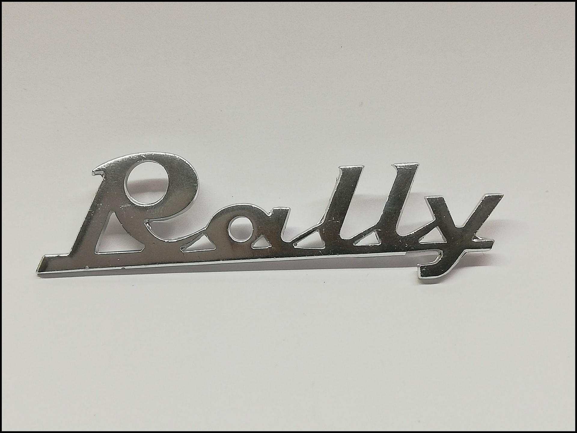 Emblema metálico prateado com a palavra Rally