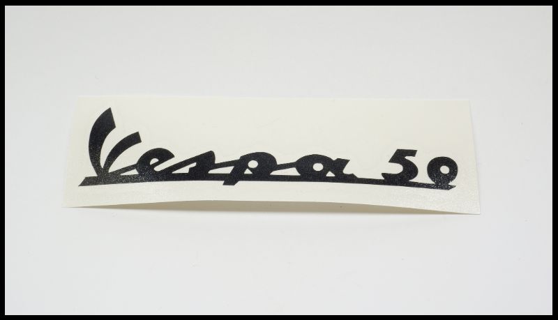 Autocolante preto com texto Vespa 50 em fundo branco