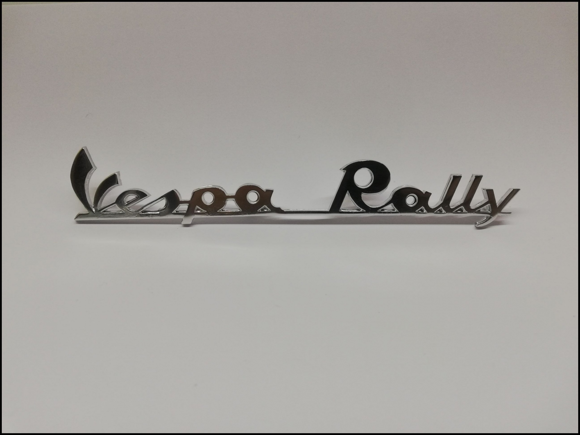 Logótipo metálico Vespa Rally em letra cursiva preta com contorno prateado