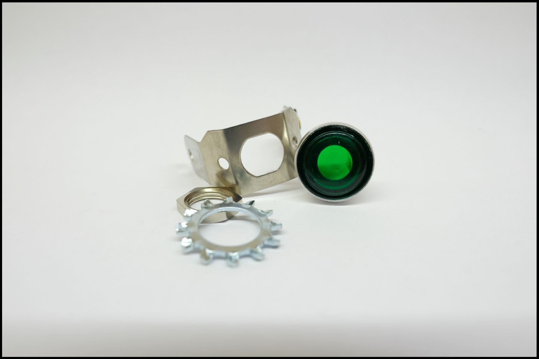 Componentes mecânicos metálicos com lente verde sobre fundo branco