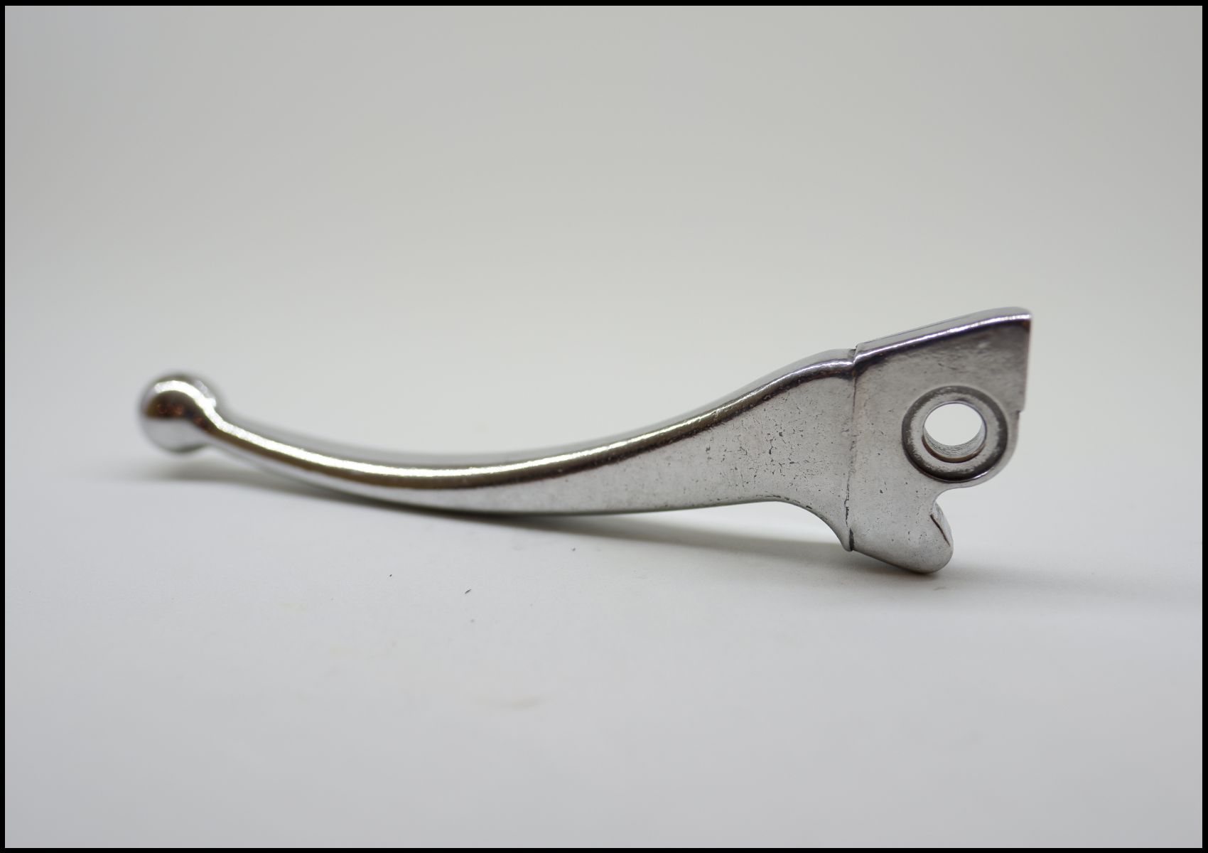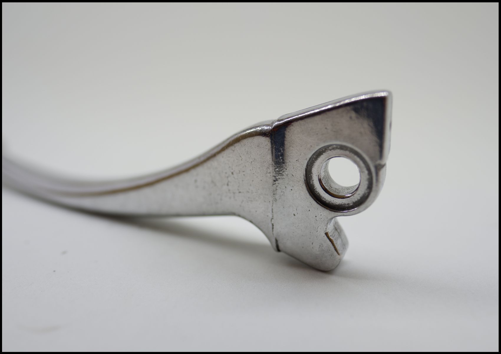 Manete metálico prateado sobre superfície branca
