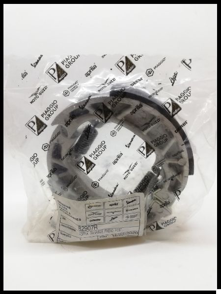 Correia ou vedante de borracha preto embalado em plástico transparente com logotipo Piaggio Group.