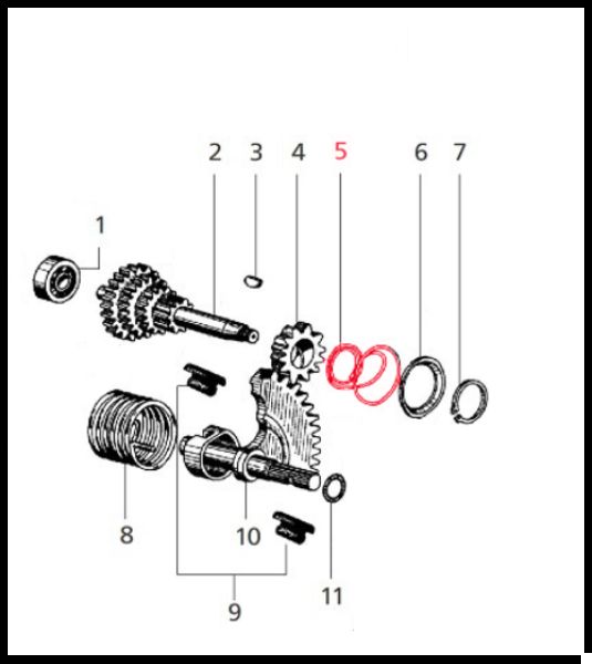 Diagrama esquemático com peças mecânicas numeradas e destacadas