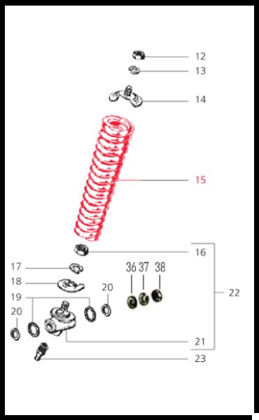 Diagrama técnico de peças mecânicas numeradas com mola vermelha