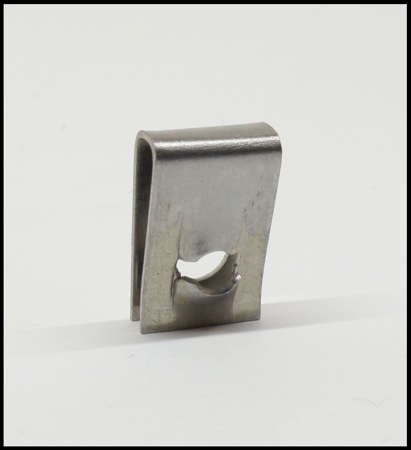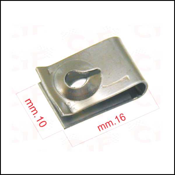 Clip metálico retangular prateado com furo e medidas 16 mm por 10 mm