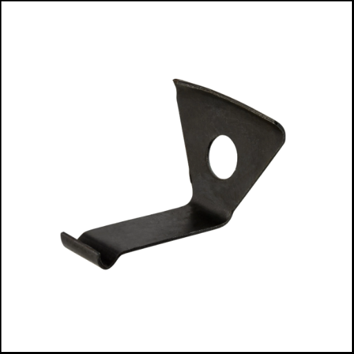 Gancho metálico preto com furo circular, sobre fundo branco