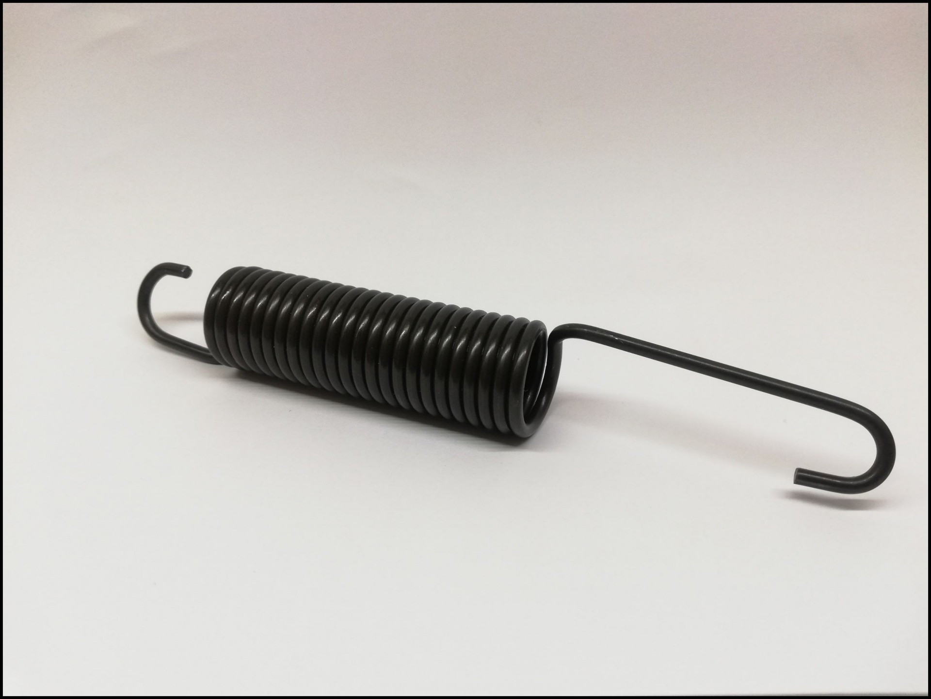 Mola de metal preta com ganchos nas extremidades sobre fundo branco