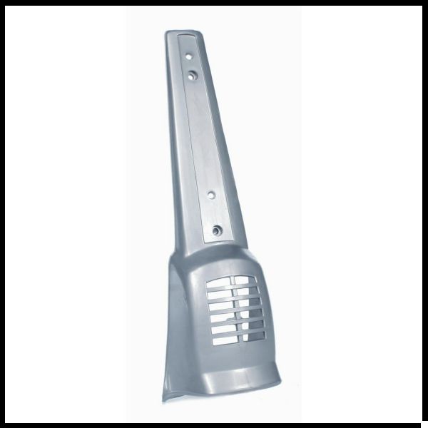 Peça plástica cinza com orifícios e ranhuras em fundo branco