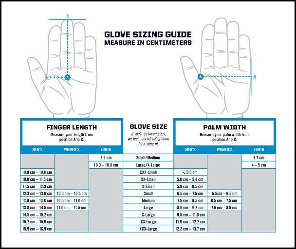 Guia de tamanhos de luvas com medições e diagramas de mão