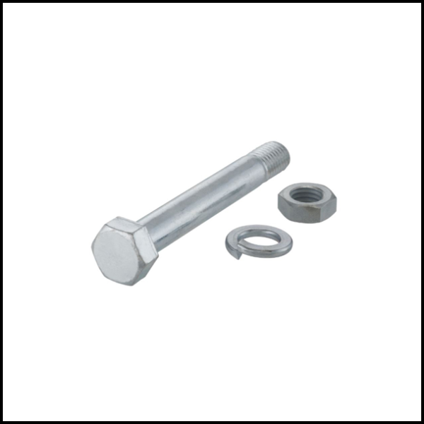 Parafuso hexagonal com porca e arruela metálica em fundo branco