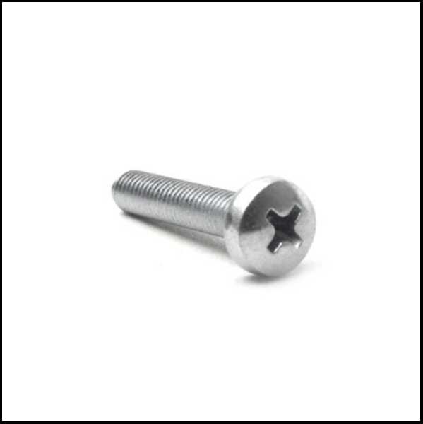 Parafuso metálico prateado com cabeça redonda e ranhura em cruz