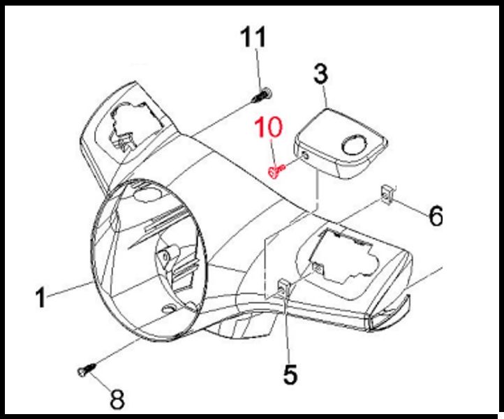Desenho técnico de peças numeradas de carcaça ou painel, com número 10 em vermelho