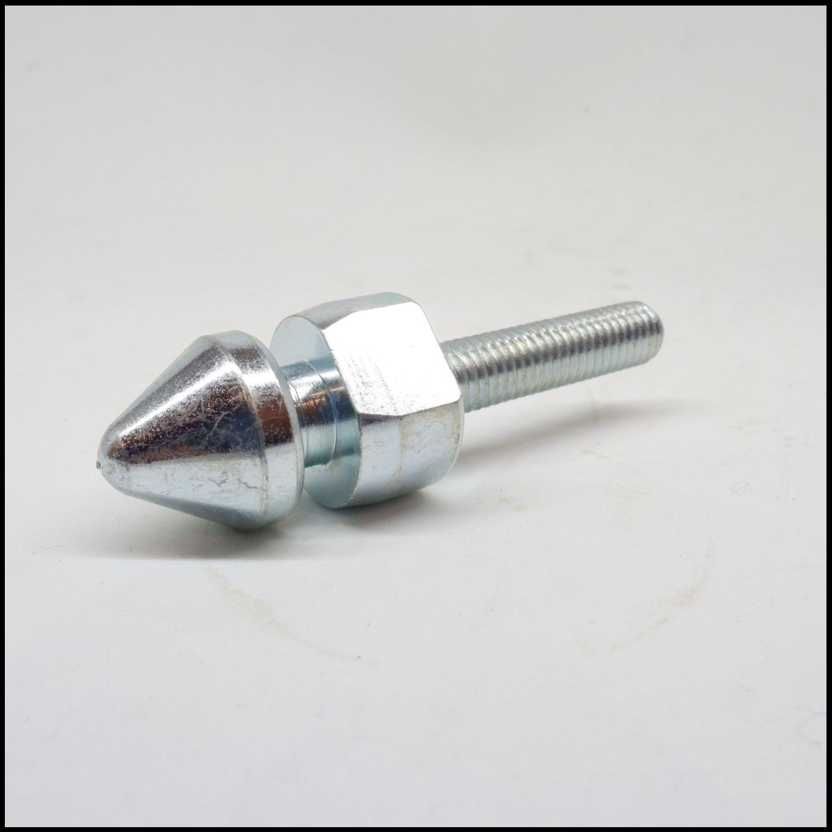 Parafuso metálico com porca e ponta cónica sobre fundo branco