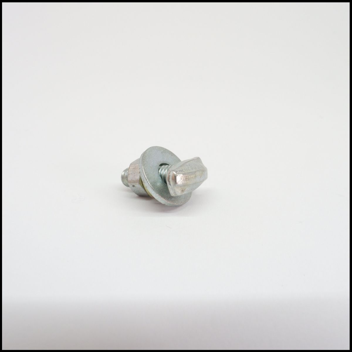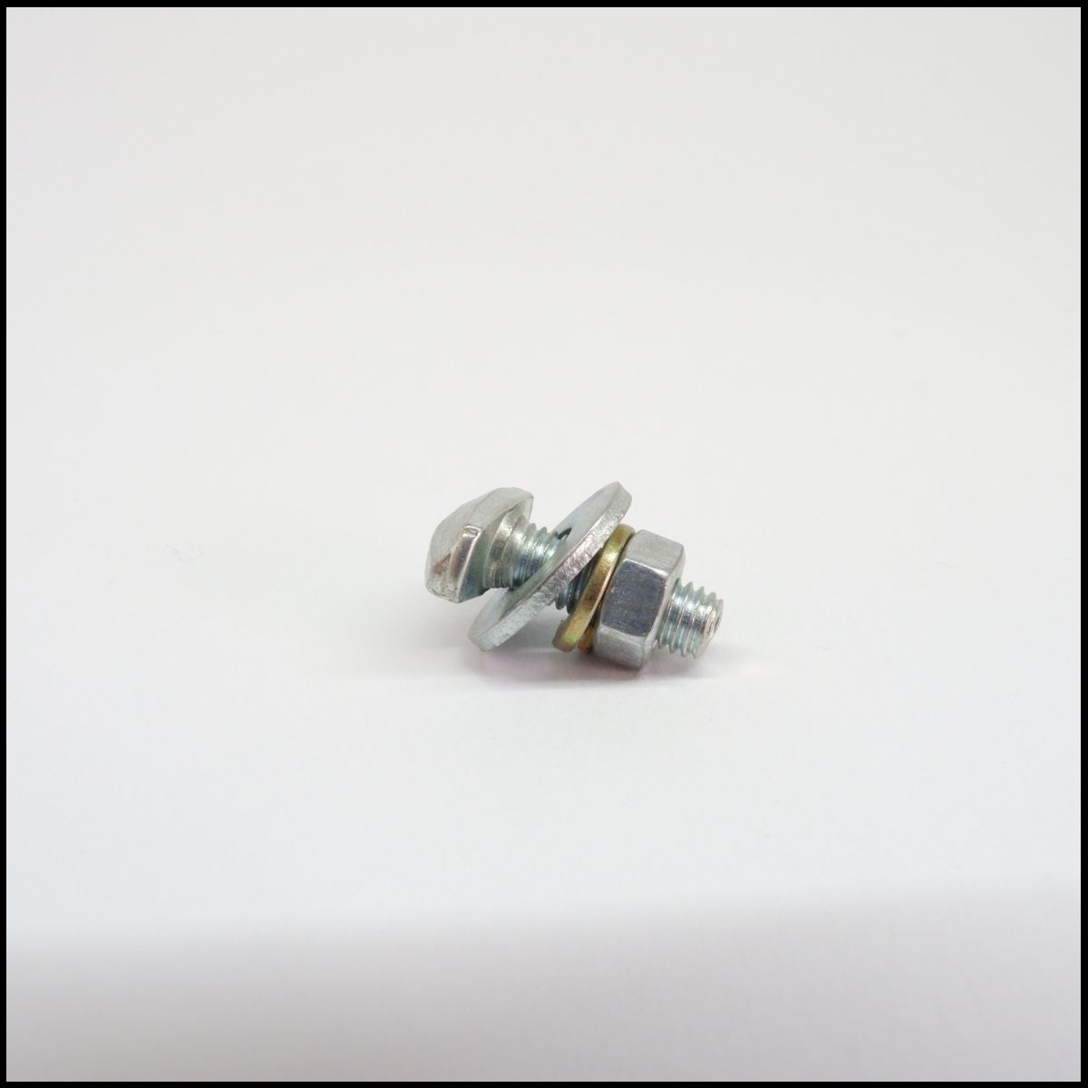 Parafuso metálico com porca e arruelas sobre superfície branca