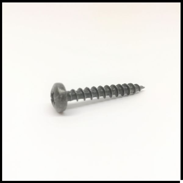 Parafuso preto de metal com rosca grossa em fundo branco