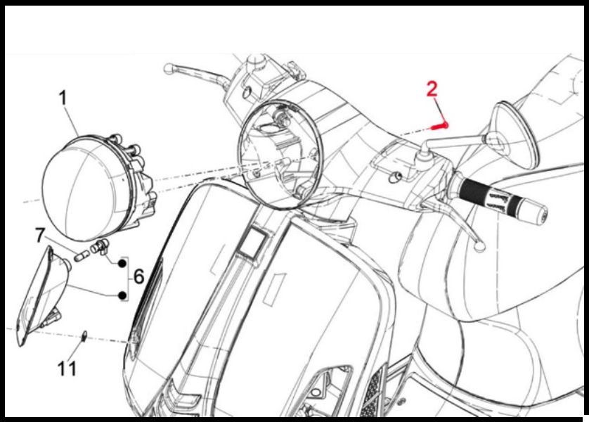 Desenho técnico em preto e branco de mota com peças numeradas