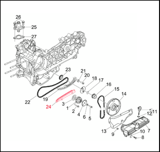 Desenho técnico de peças mecânicas numeradas com destaque em vermelho no número 24