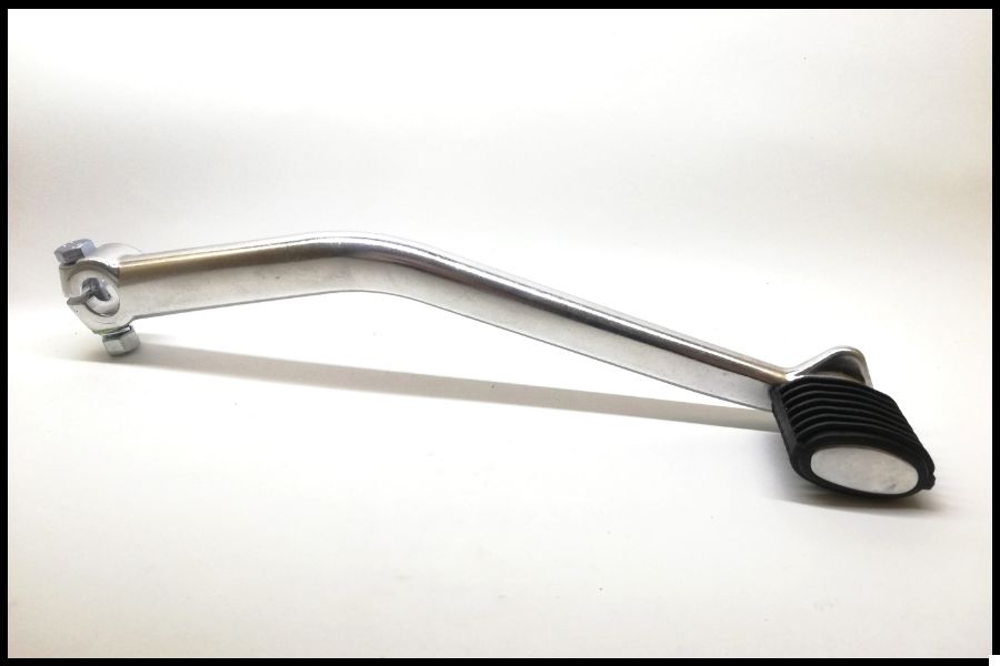 Pedal metálico com ponta de borracha preta sobre fundo branco