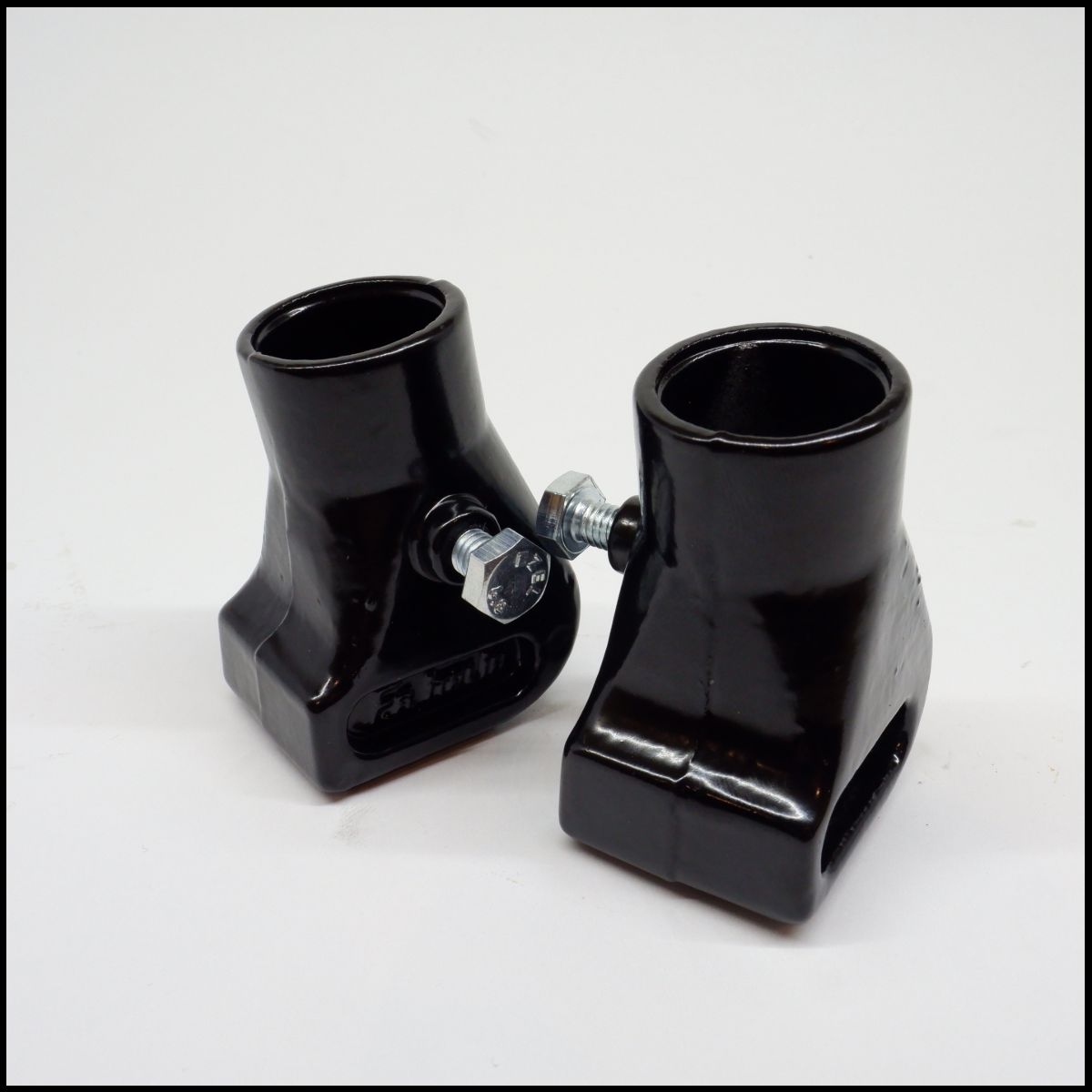 Par de suportes pretos com parafusos, sobre fundo branco