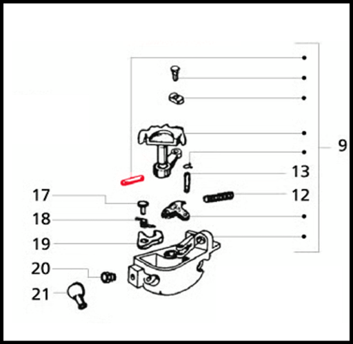 Diagrama técnico de peças mecânicas com nove componentes numerados em fundo branco