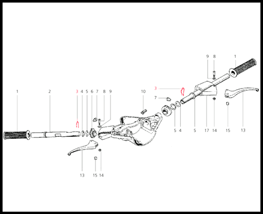 Desenho técnico do manípulo de comando com peças numeradas e punhos