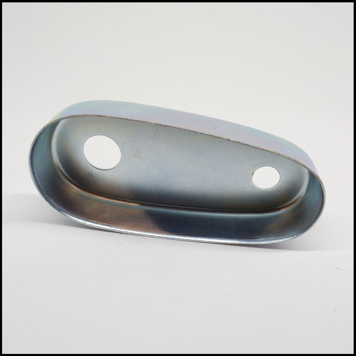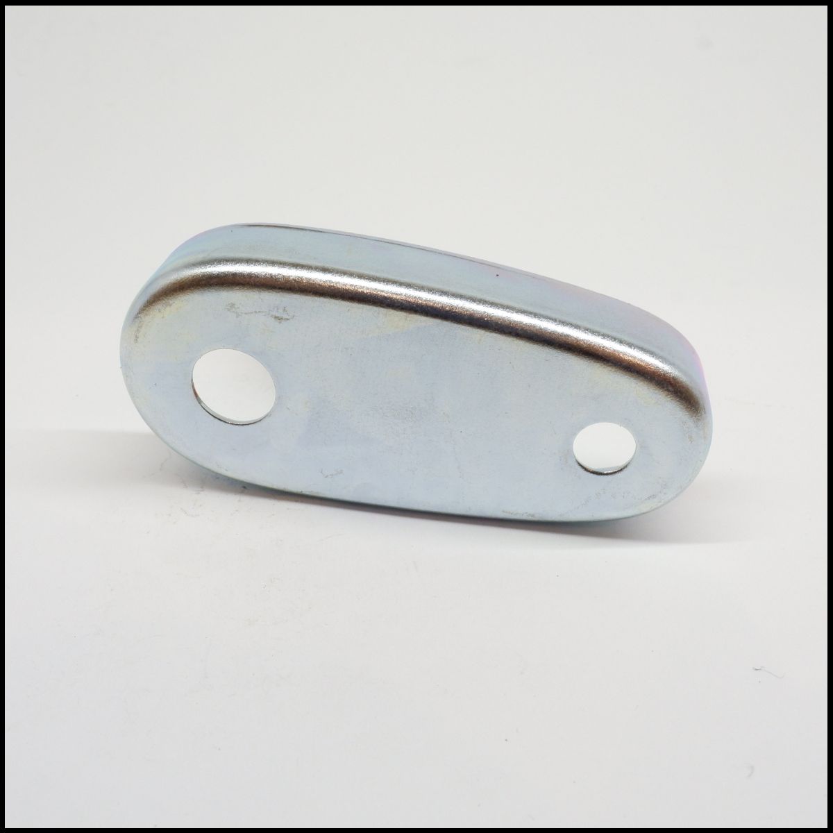 Peça metálica oval prateada com dois furos