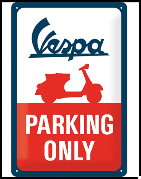 Placa metálica branca e vermelha Vespa Parking Only com scooter vermelha