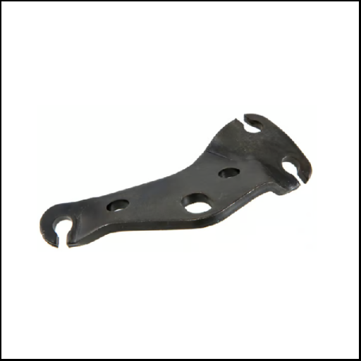 Peça metálica preta com orifícios e encaixes curvos em fundo branco