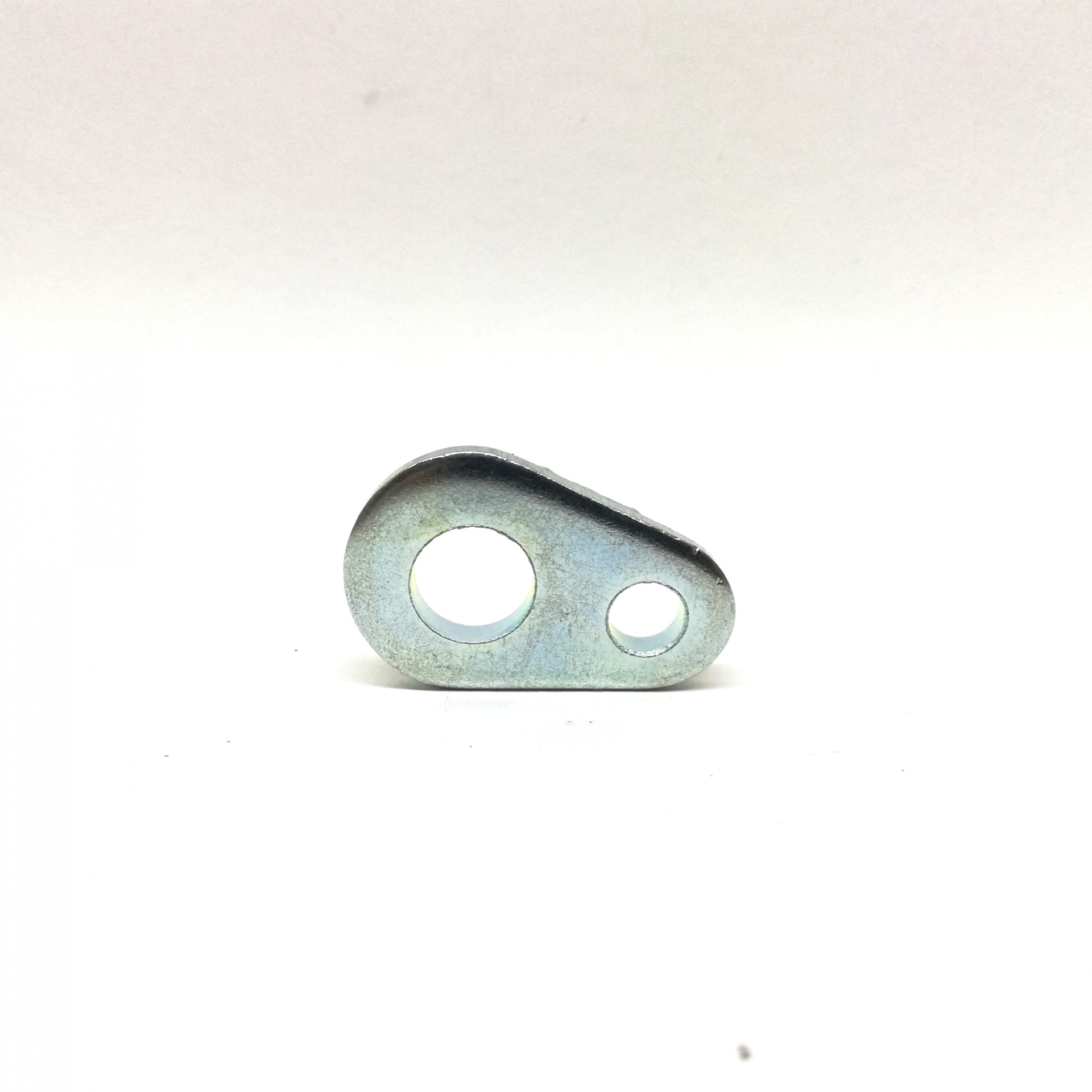 Peça metálica pequena prateada com dois orifícios sobre fundo branco
