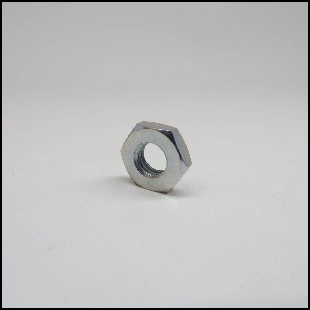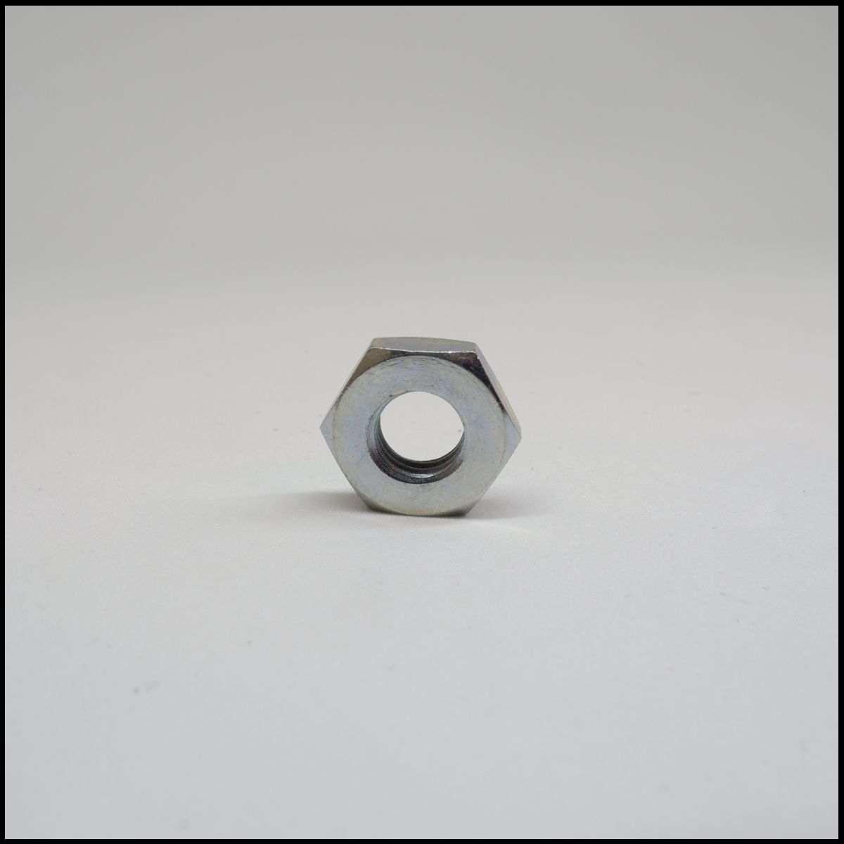 Porca metálica hexagonal prateada numa superfície branca
