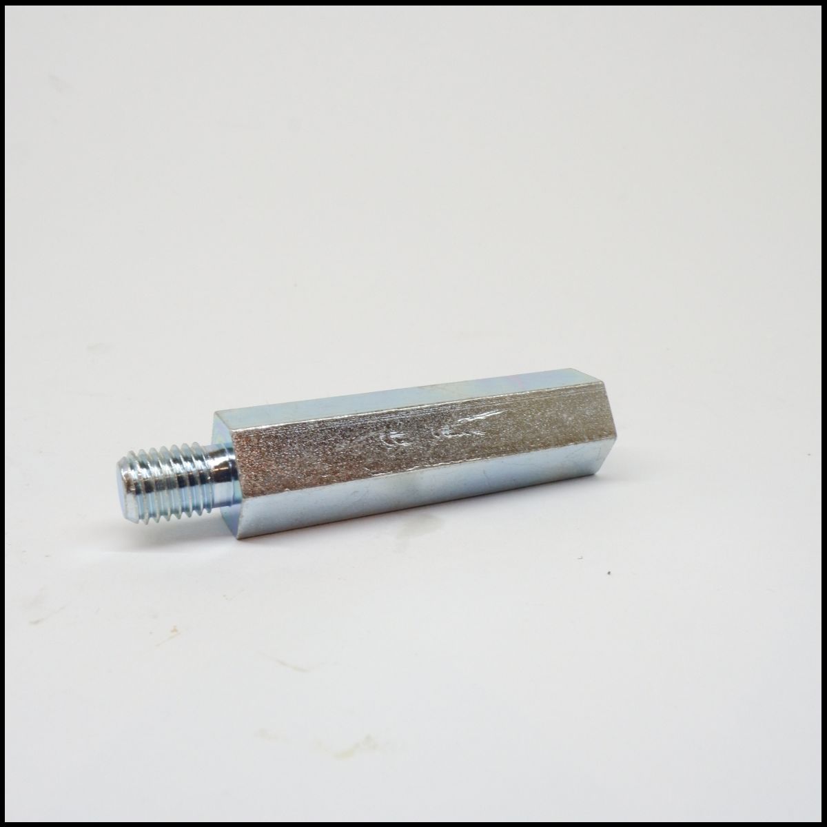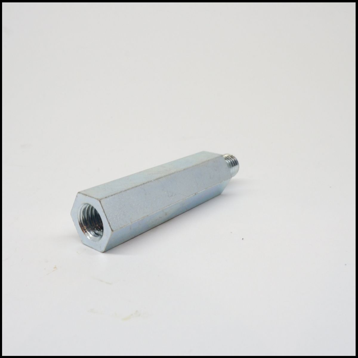Peça metálica hexagonal com rosca numa das extremidades em fundo branco