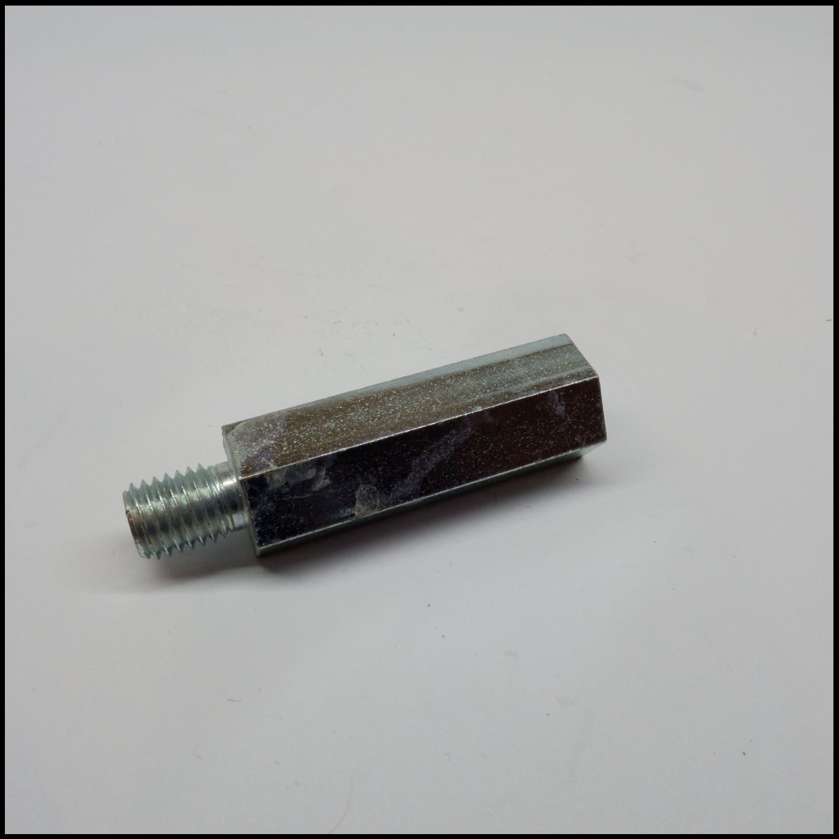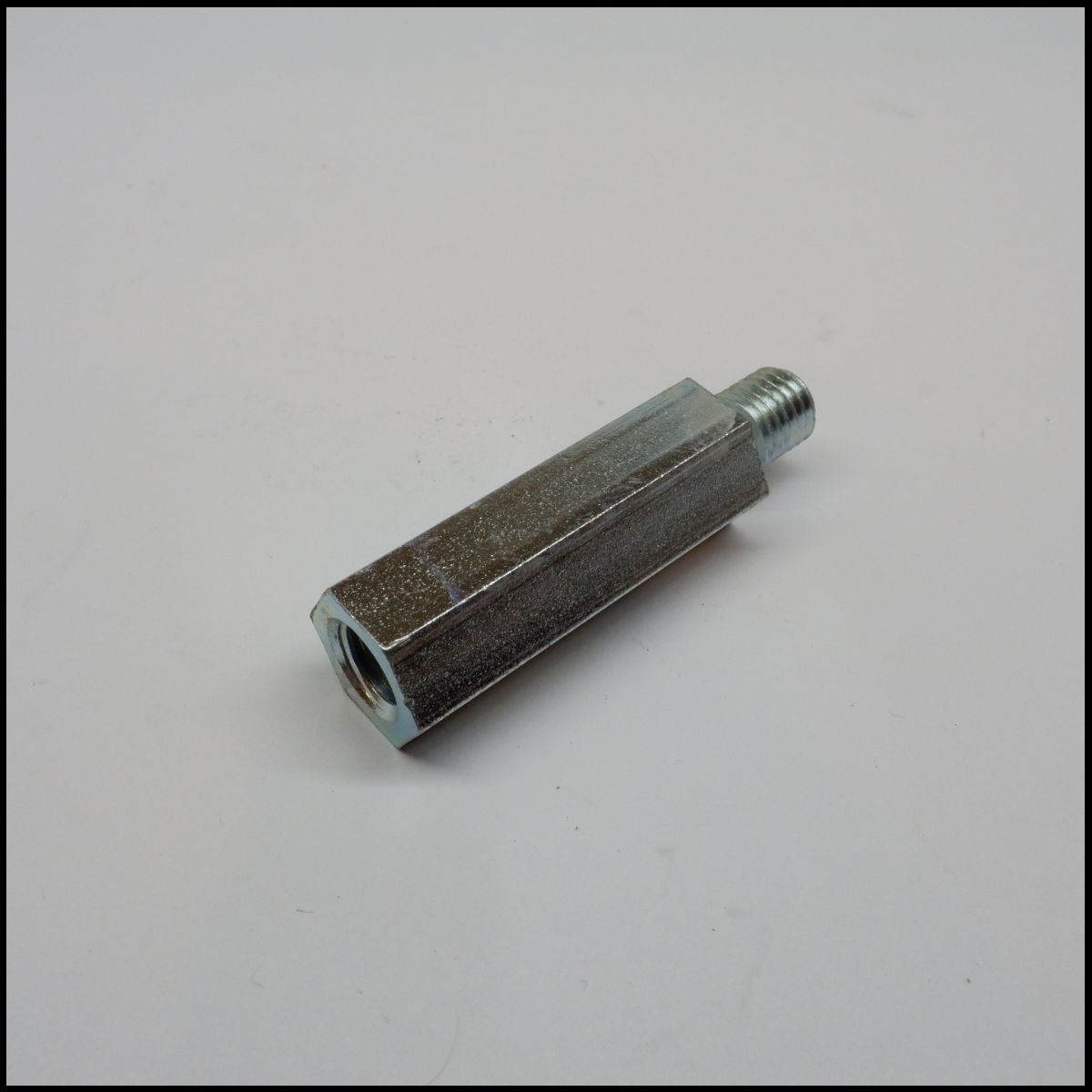 Parafuso espaçador hexagonal metálico prateado com roscas, sobre fundo branco