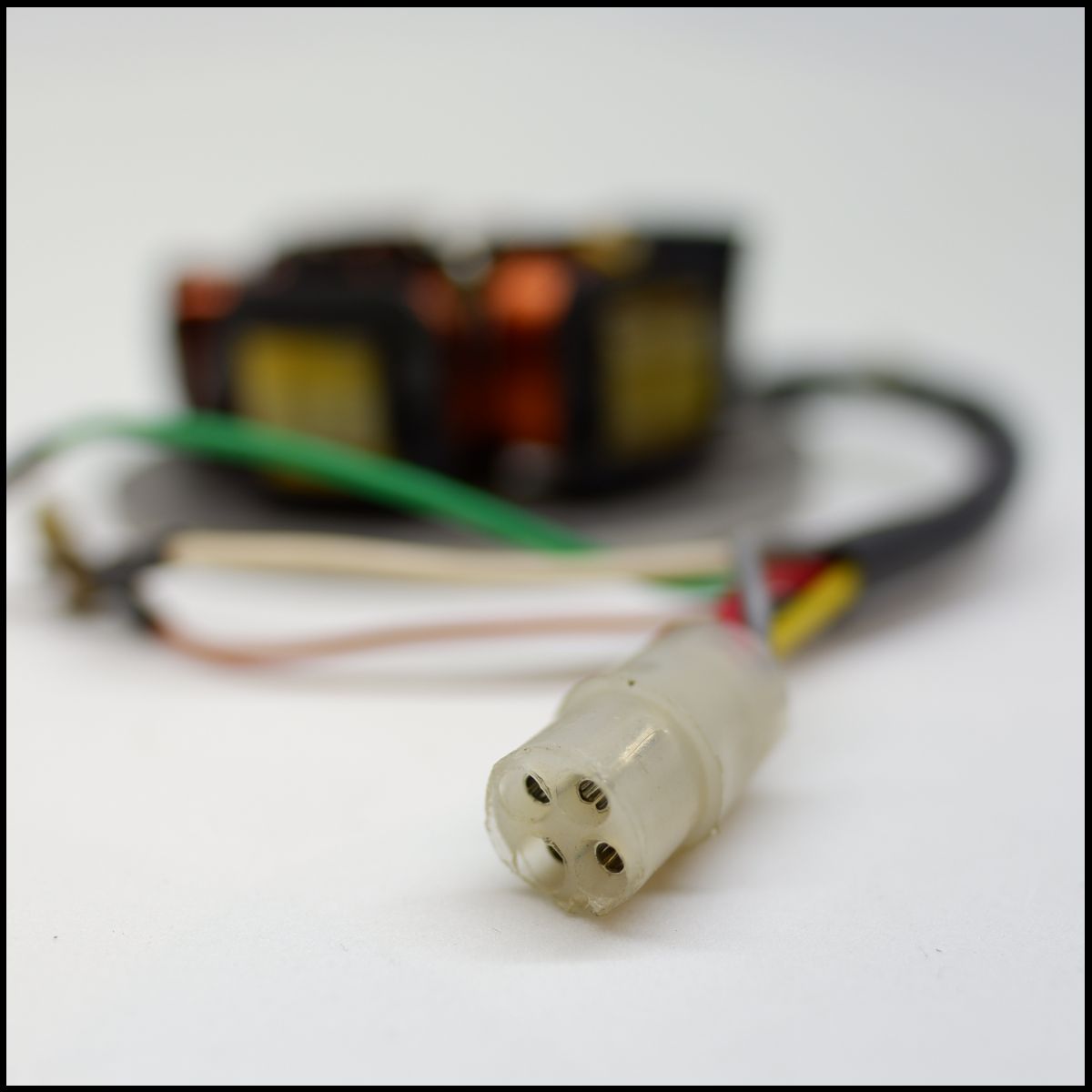 Conector elétrico branco com fios coloridos e bobina magnética desfocada