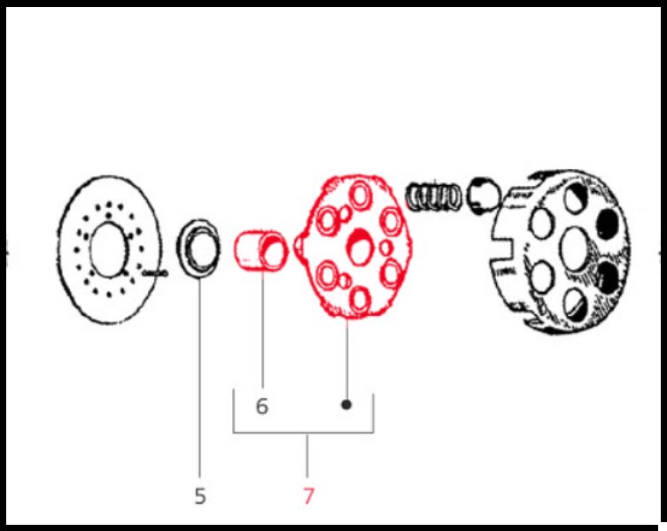 Diagrama técnico de peças mecânicas circulares com números 5, 6 e 7
