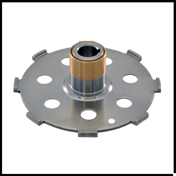 Peça metálica circular com orifícios e eixo central de cor bronze sobre fundo branco
