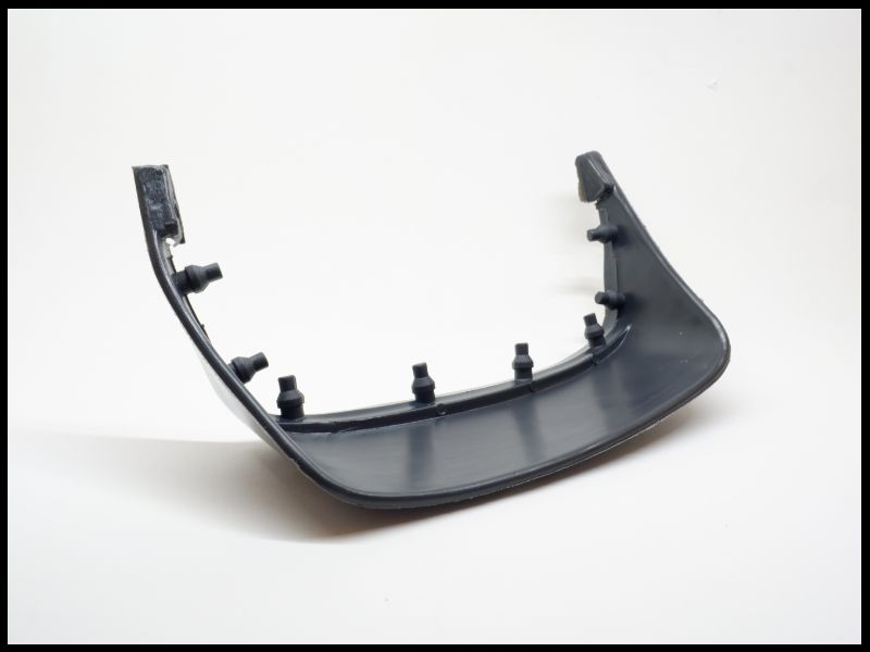 Peça plástica preta curva com pinos salientes sobre fundo branco