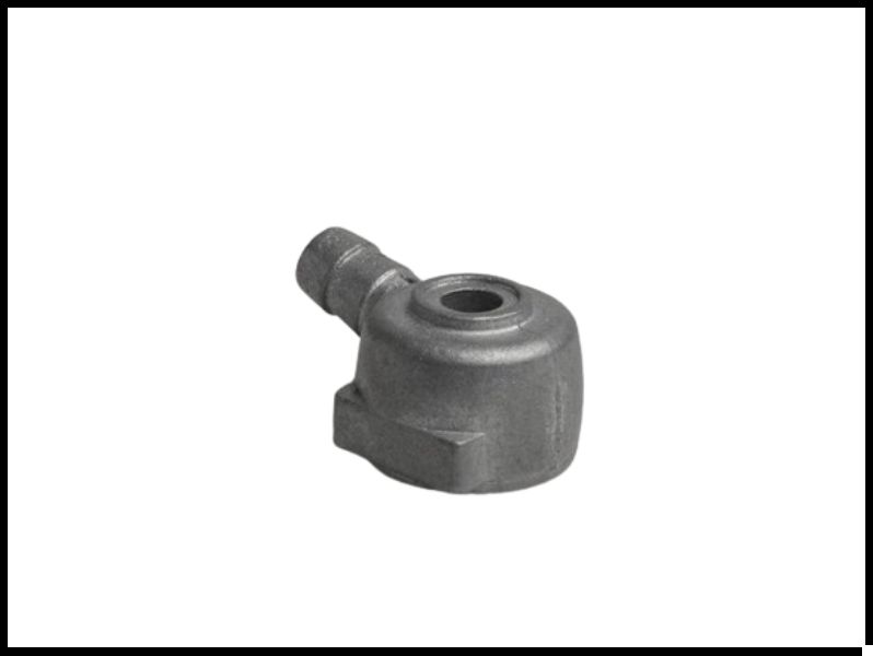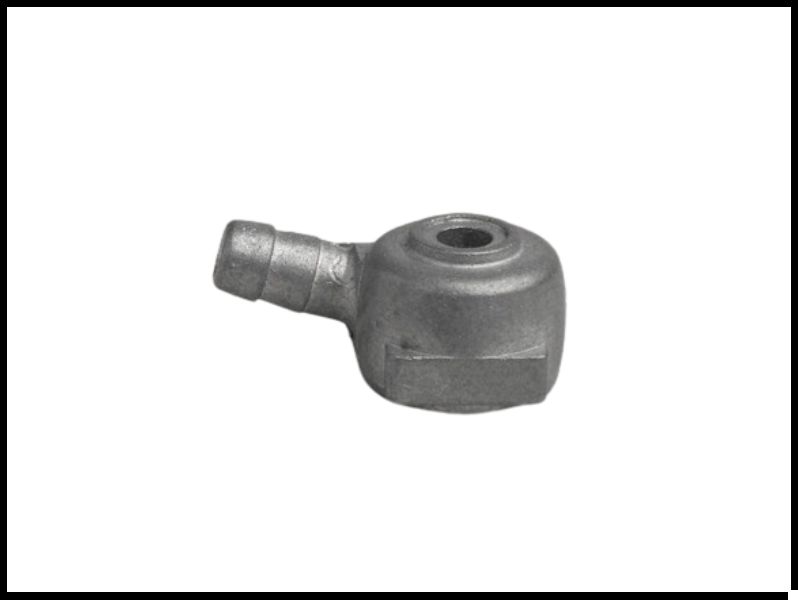 Peça metálica cinza fosca com conexão tubular e fundo branco