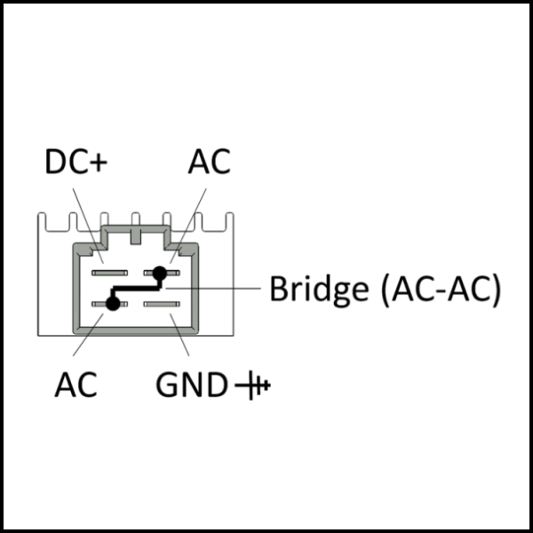Diagrama elétrico de ponte retificadora com marcações DC+, AC, GND e ligações internas