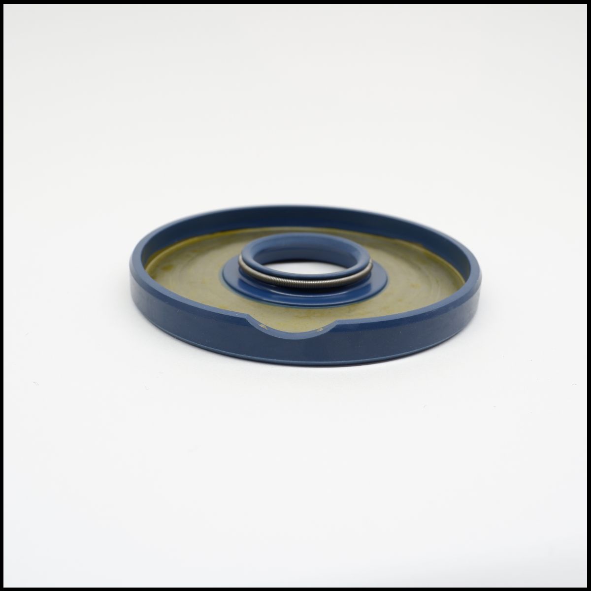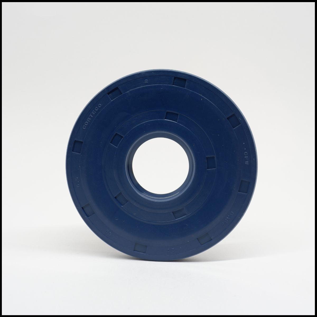 Objeto circular azul escuro com orifício central em fundo branco