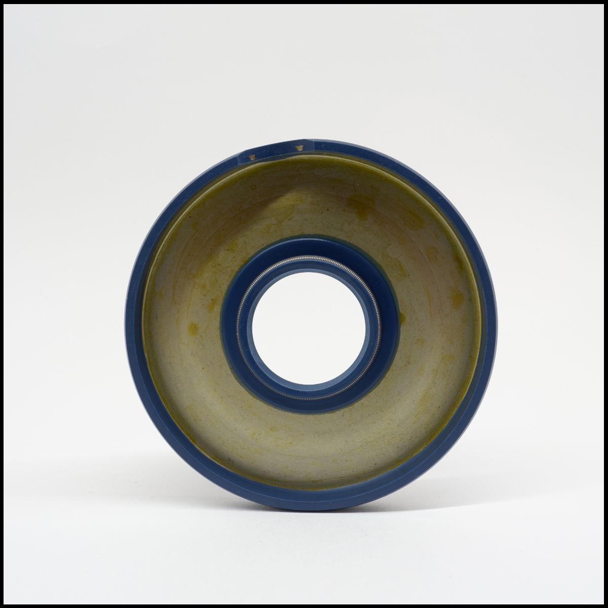 Objeto cerâmico circular com centro aberto e bordas azuis