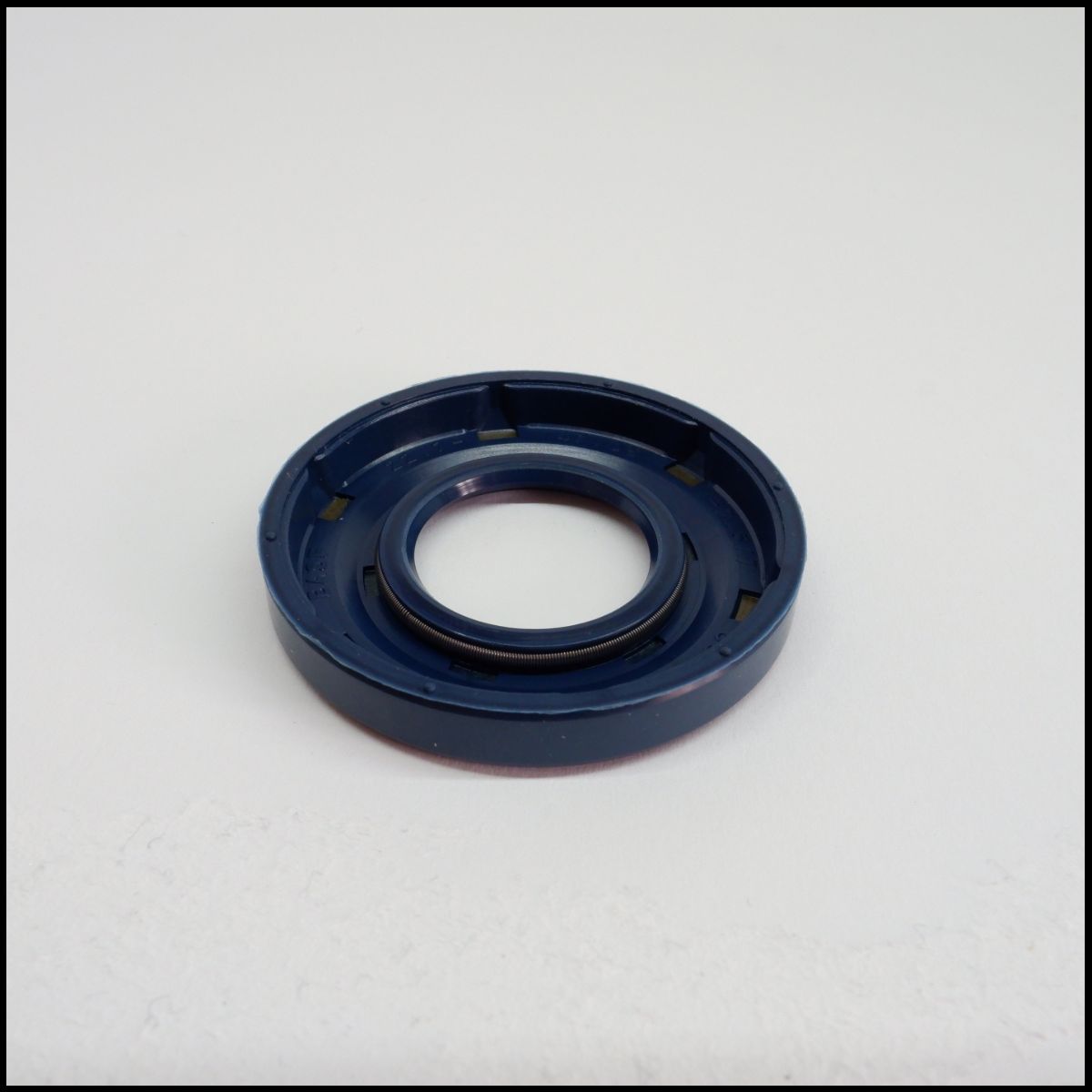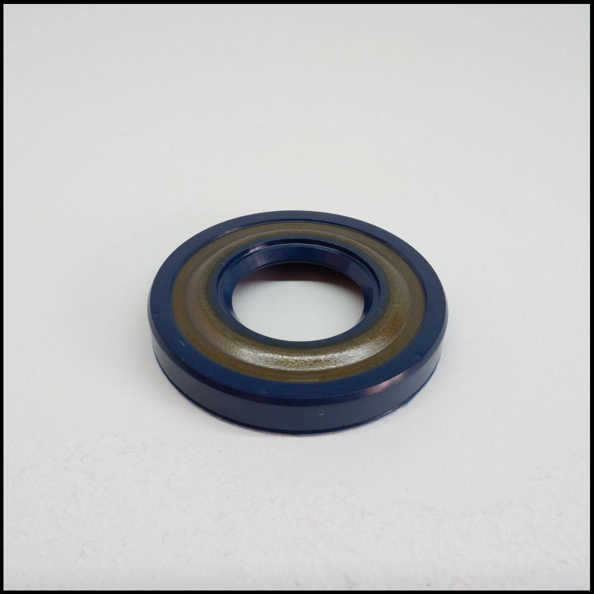 Anel de vedação circular azul com interior castanho sobre superfície branca