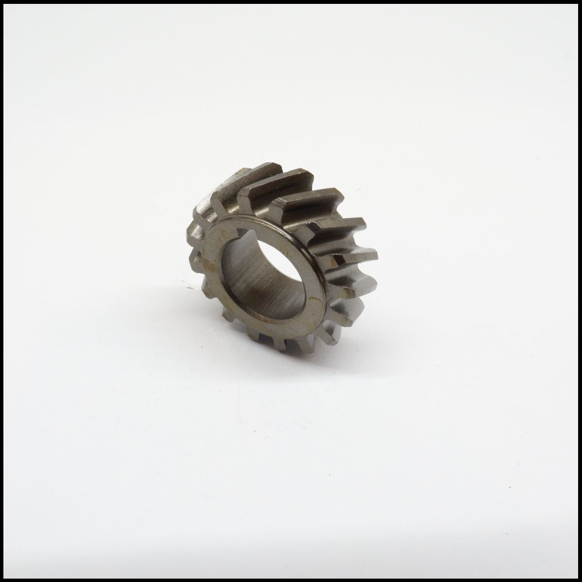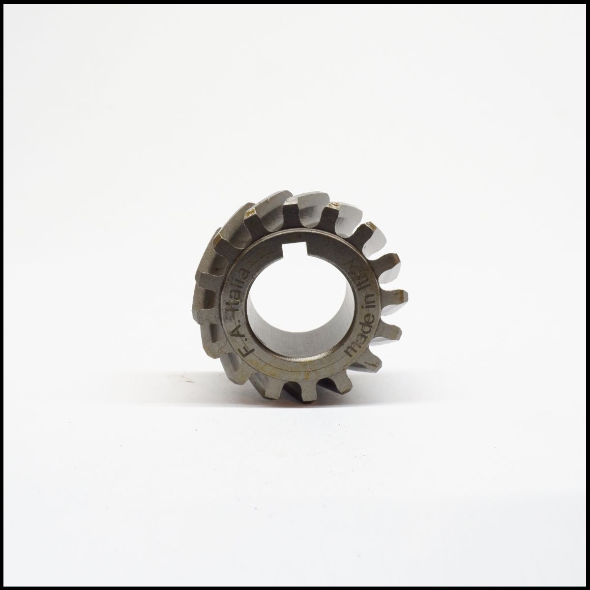 Engrenagem metálica cinza com inscrições visíveis sobre fundo branco