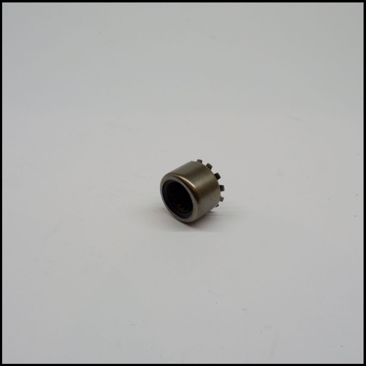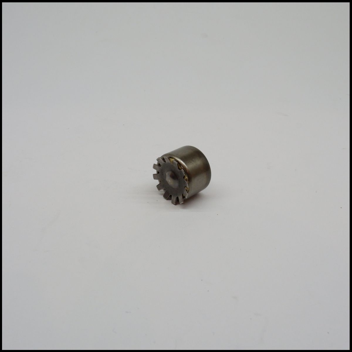 Peça metálica pequena com dentes em fundo branco
