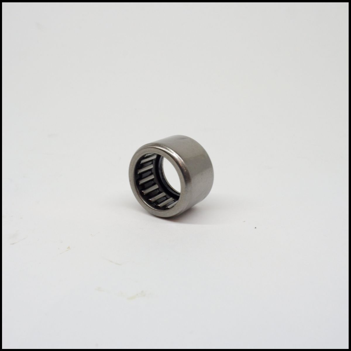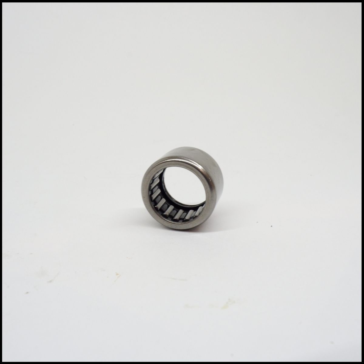 Rolamento de agulhas metálico prateado sobre superfície branca