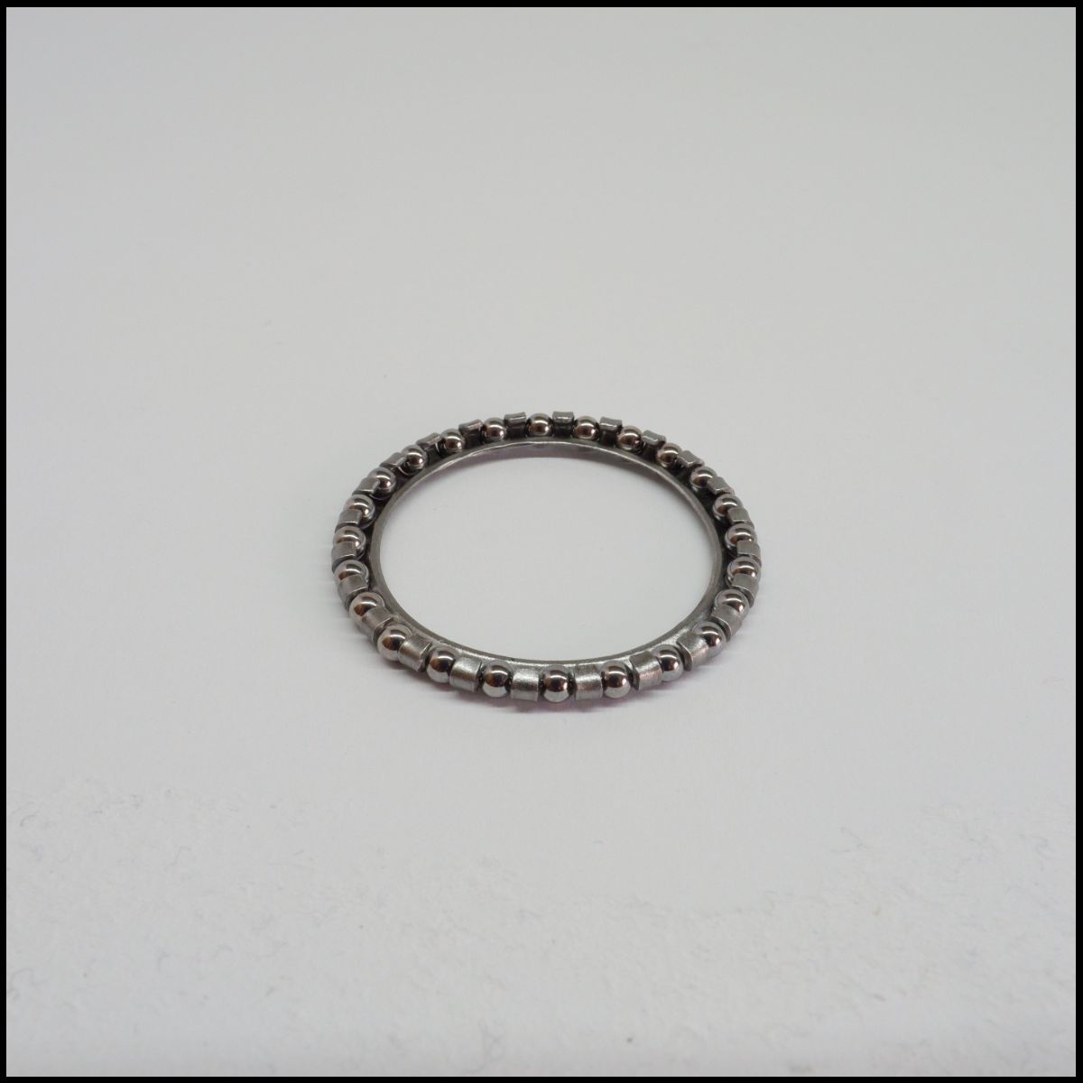 Anel metálico circular prateado com detalhes arredondados sobre fundo branco