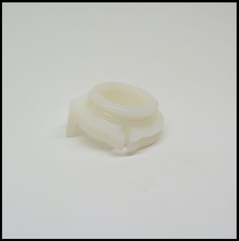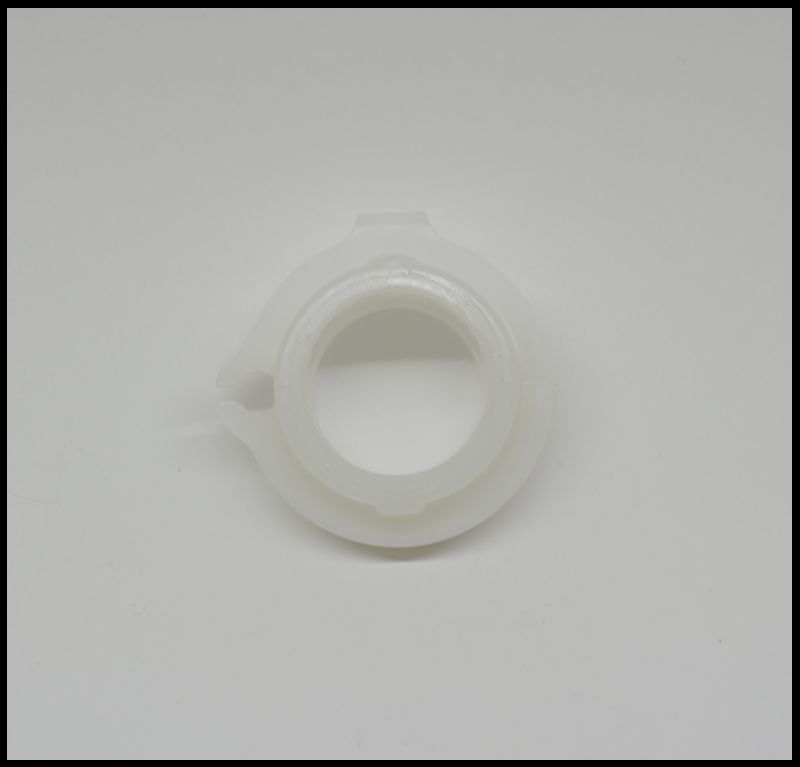 Peça plástica branca translúcida circular com saliência para fixação