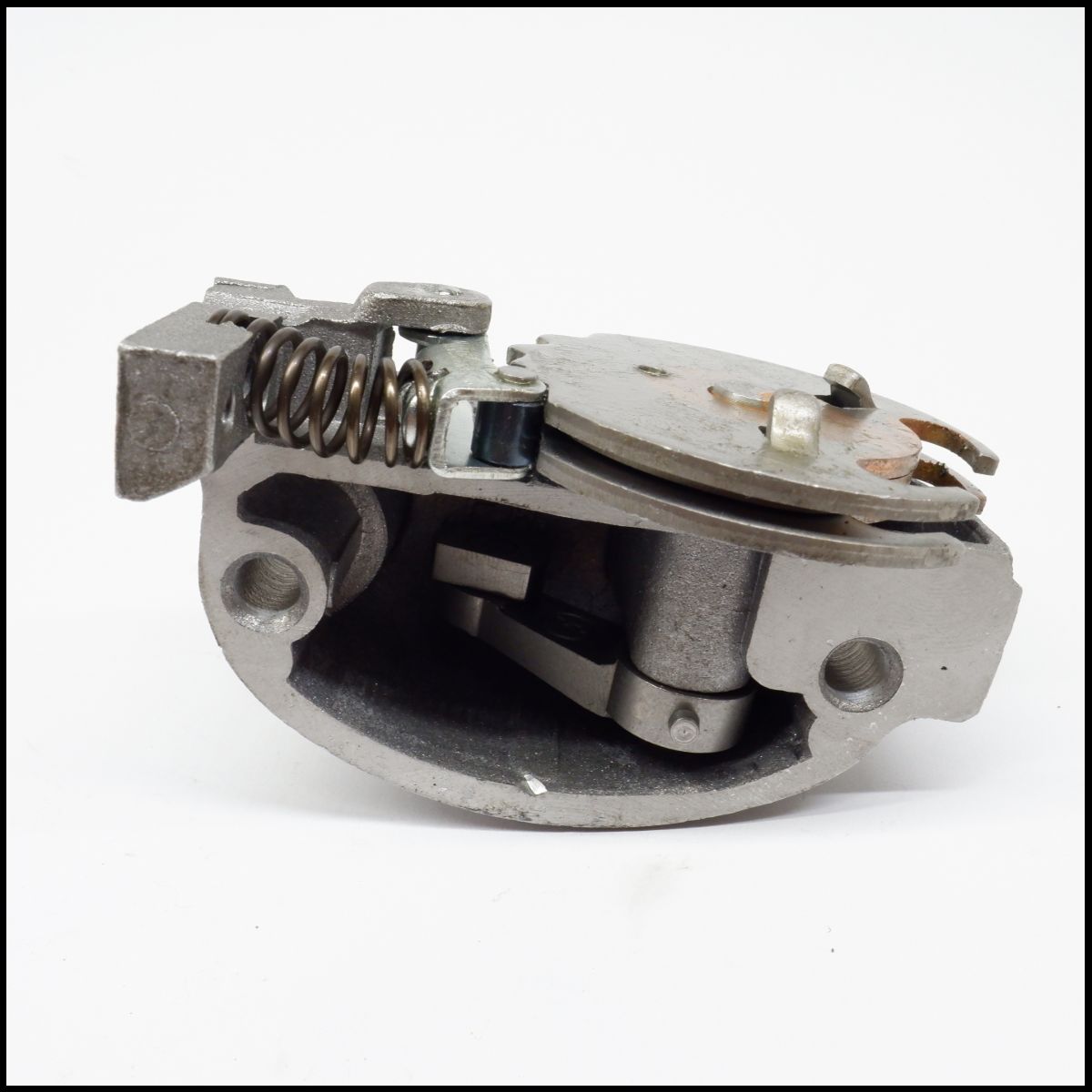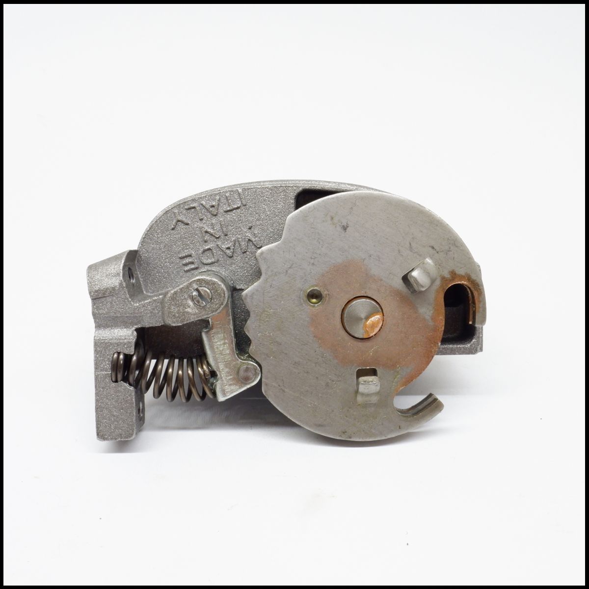 Peça metálica mecânica cinza com mola e texto MADE IN ITALY