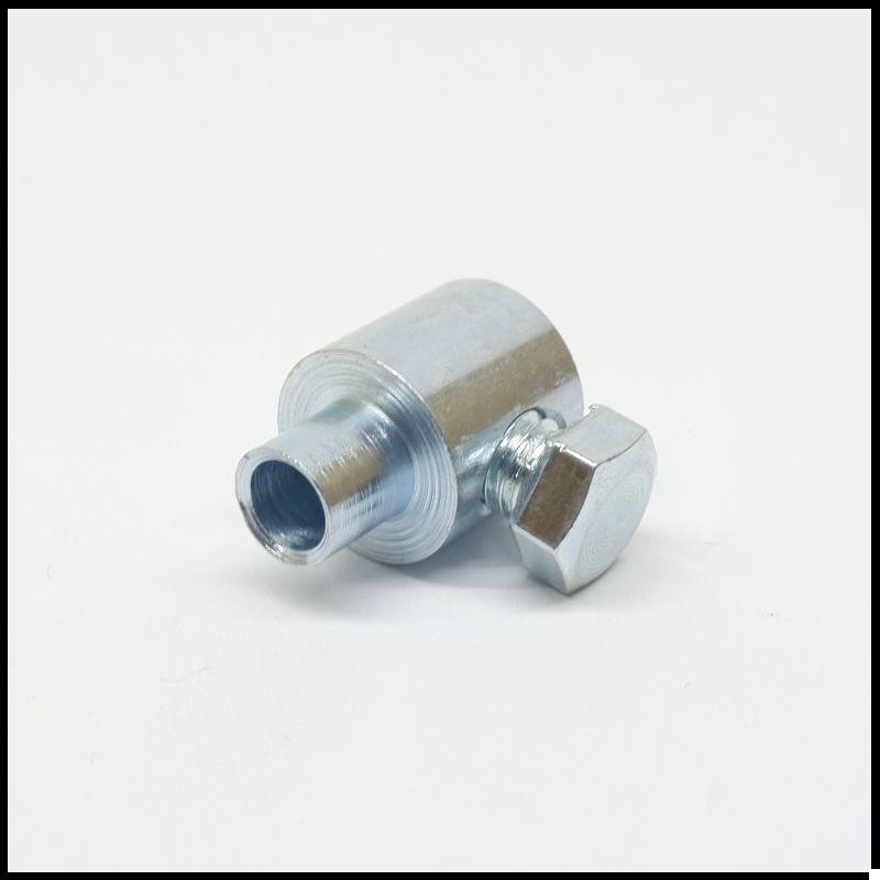 Peça metálica prateada com porca hexagonal e tubo cilíndrico