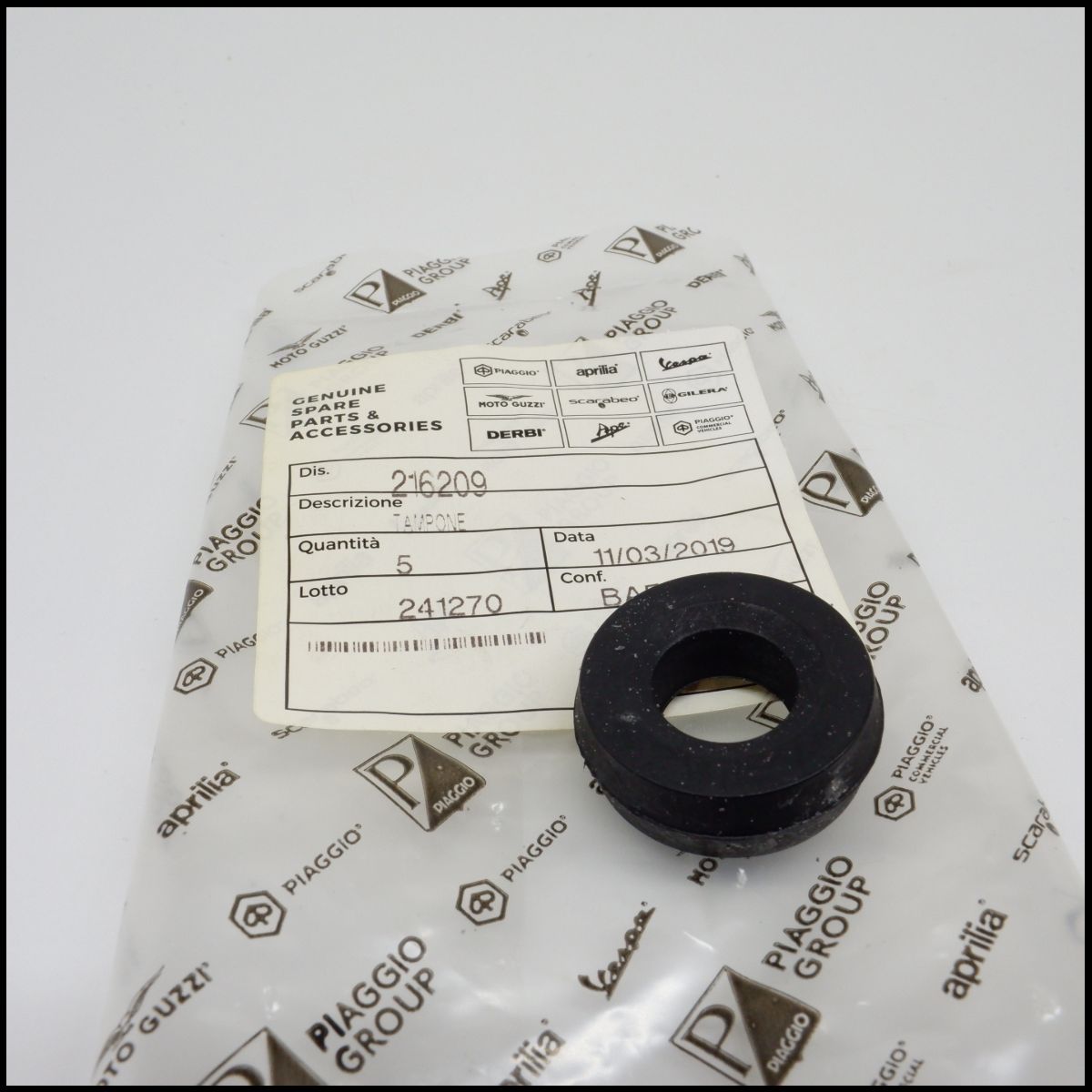 Anel de borracha preta sobre embalagem plástica branca com logotipos Piaggio Group e etiqueta com informações.