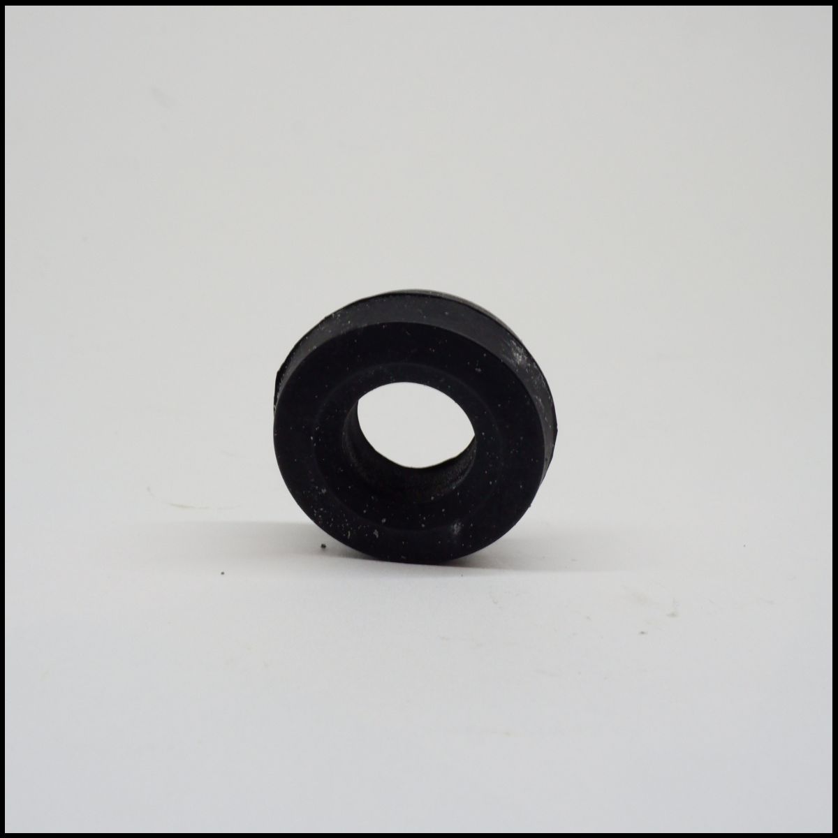 Peça redonda preta com furo central sobre superfície branca